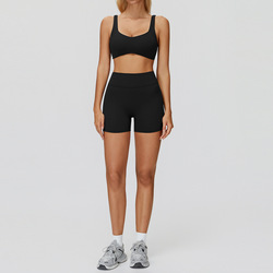 طقم شورت يوجا نسائي بدون حمالات وخصر مرتفع مع حمالة صدر، تصميم مريح ومرن بدون خياطة أمامية، خفيف الوزن وقابل للتنفس